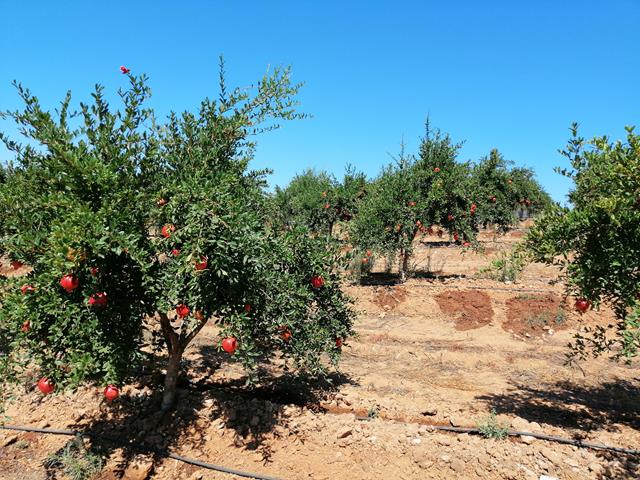 O pomar tem neste momento em plena produção 10,5 ha (plantação de 2017) de romã de 2 variedades e foram plantados, em 2023, cerca de 2 ha de alfarrobeiras.